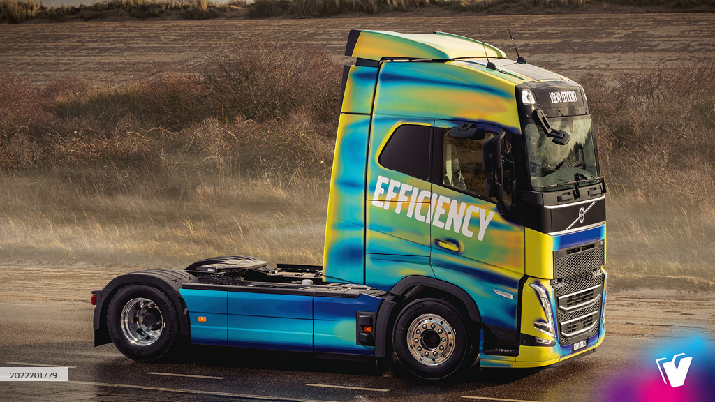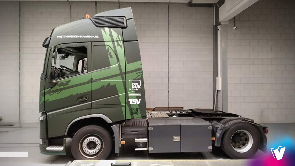 Volvo trekker voorzien van windtunnel effect printwrap.